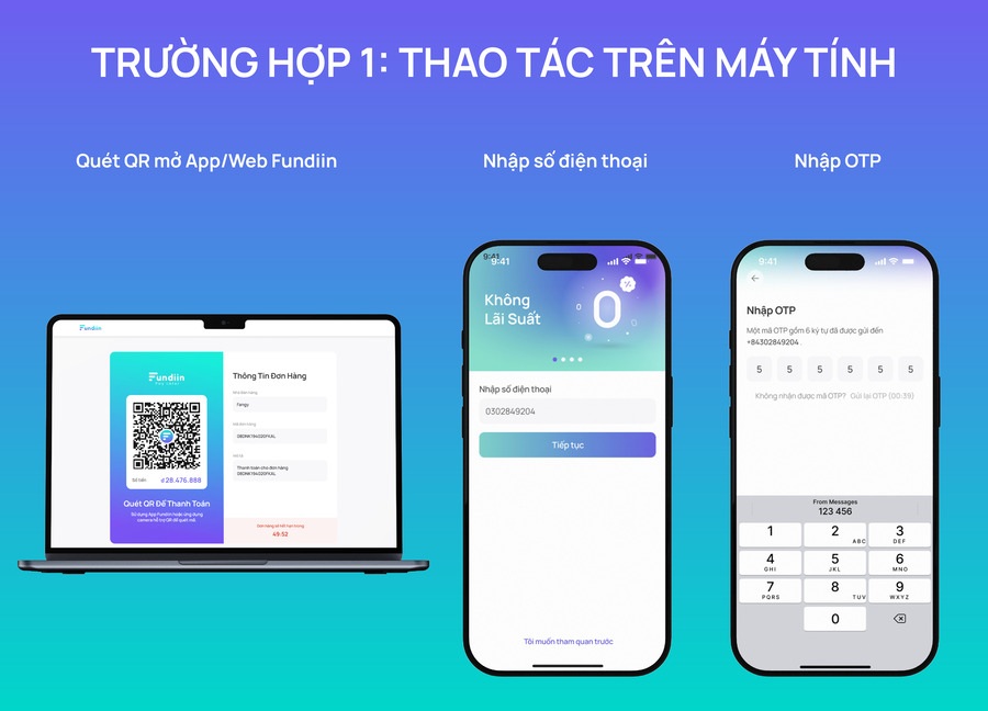 Nếu bạn đang thao tác trên máy tính: Quét QR bằng điện thoại để mở app/web Fundiin. Sau đó tiến hành đăng nhập bằng cách nhập số điện thoại và mã OTP.