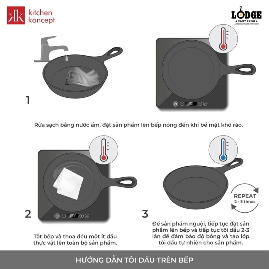 Đây là 2 cách tôi chảo gang mới mua mà Kitchen Koncept chia sẻ đến bạn. Nếu bạn đang có một chiếc chảo gang Lodge chính hãng thì cách tôi chảo gang Lodge cũng hoàn toàn tương tự.